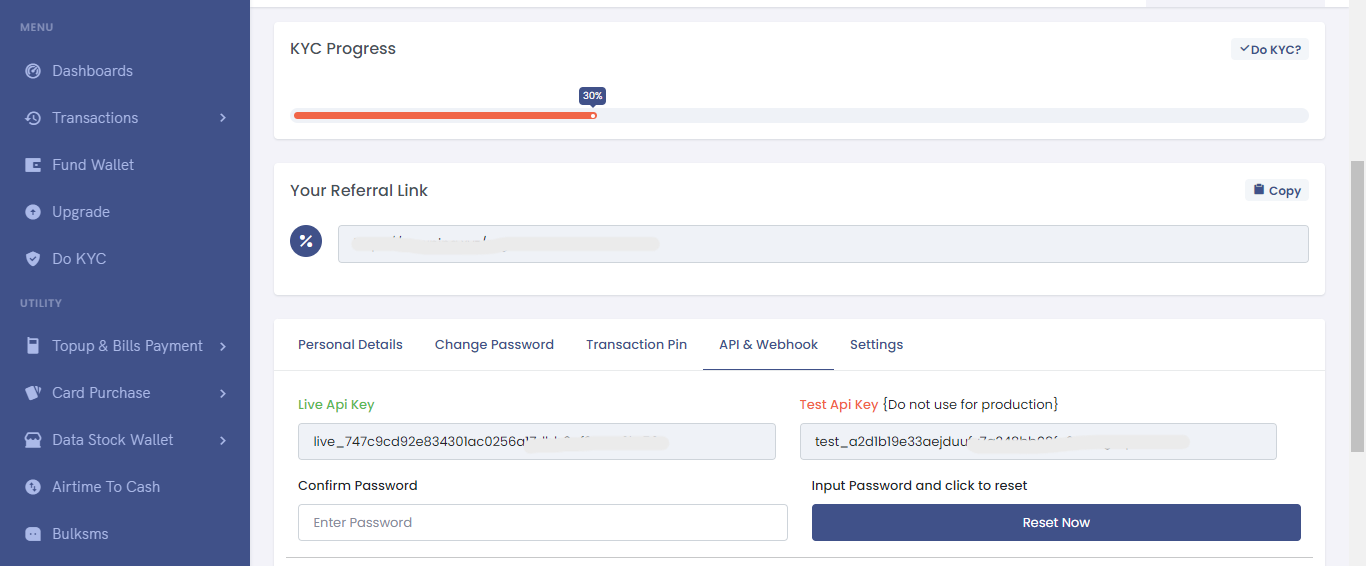 When you sign up for Nazzytelecom, your API keys are generated automatically. To obtain your keys, please go to the dashboard, click on the Account Settings link, and look for your API key under the API & Webhook tabs.