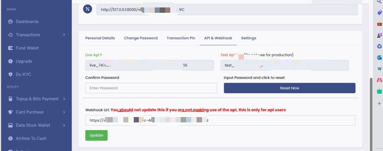 In other to take advantage of webhooks, you will have to first set up a publicly available URL that Nazzytelecom can have access to. To set up one, kindly go to your dashboard, click on the Account Settings link and check under the API & Webhook tabs, there, you will find an input box for your webhook.